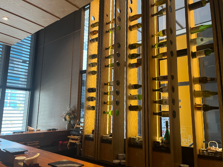 각종 와인, 사케 병들로 인테리어가 되어있어요.